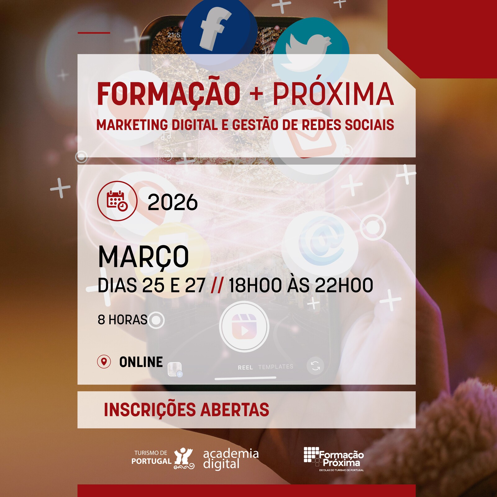A Câmara Municipal proporciona, numa parceria com o Turismo de Portugal e no âmbito do programa Formação +Próxima, uma ação online com um total de oito horas, gratuita, dedicada a “Marketing Digital e Gestão de Redes Sociais”.