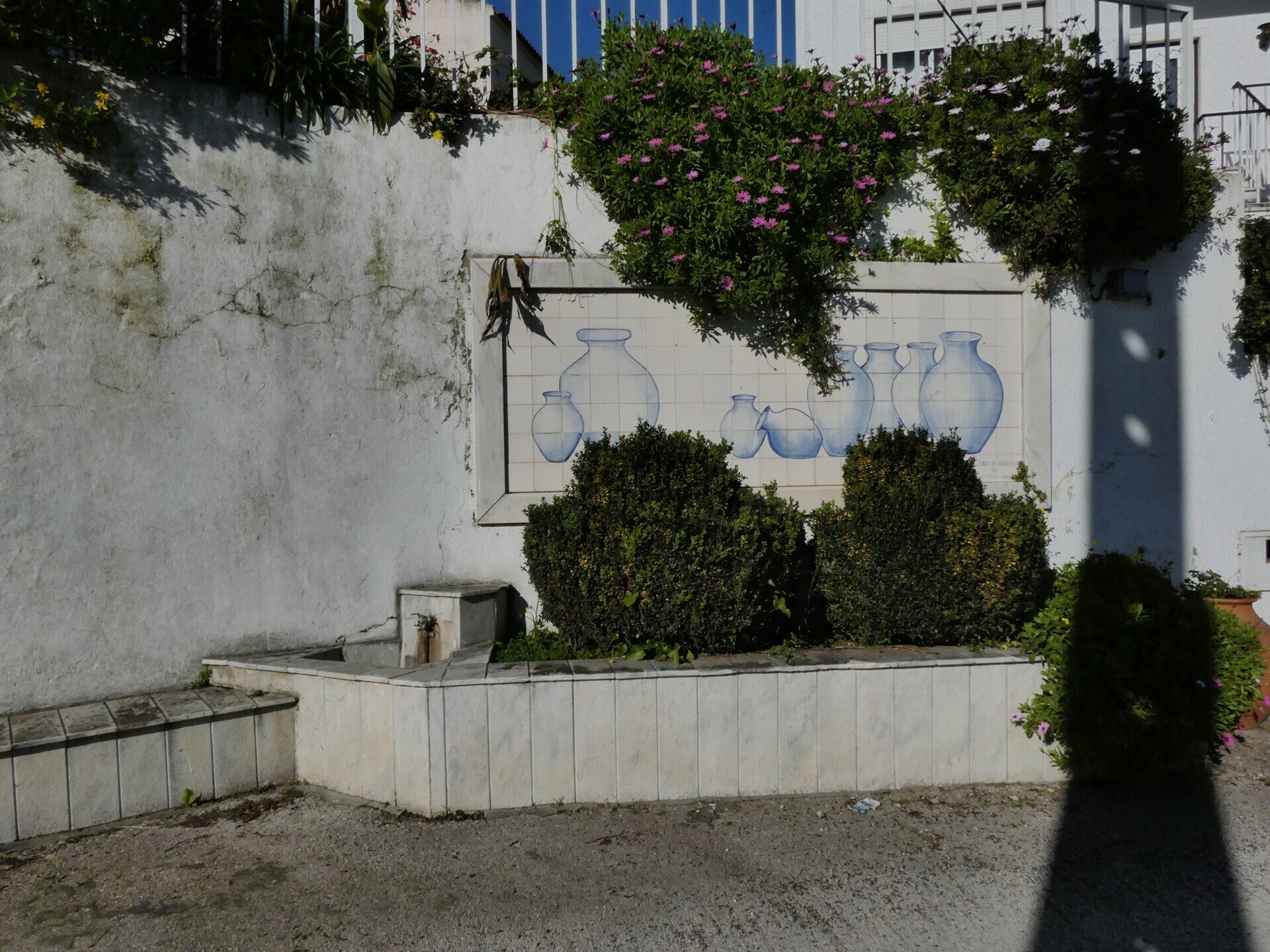 DESCRIÇÃO: Fonte com pequeno canteiro com plantas, sobre a qual existe um painel de azulejos representando potes de diferentes tamanhos. Estes potes, que em tempos foram